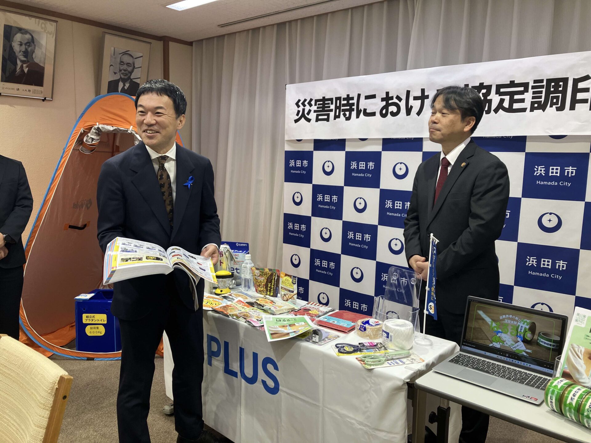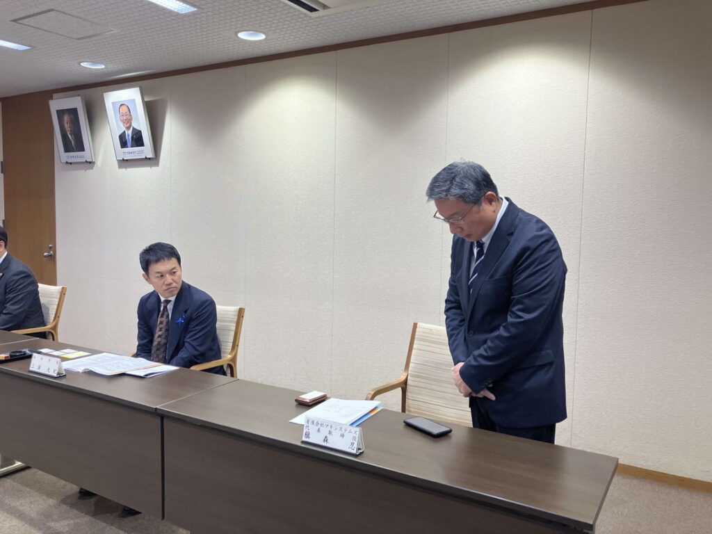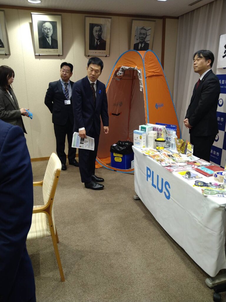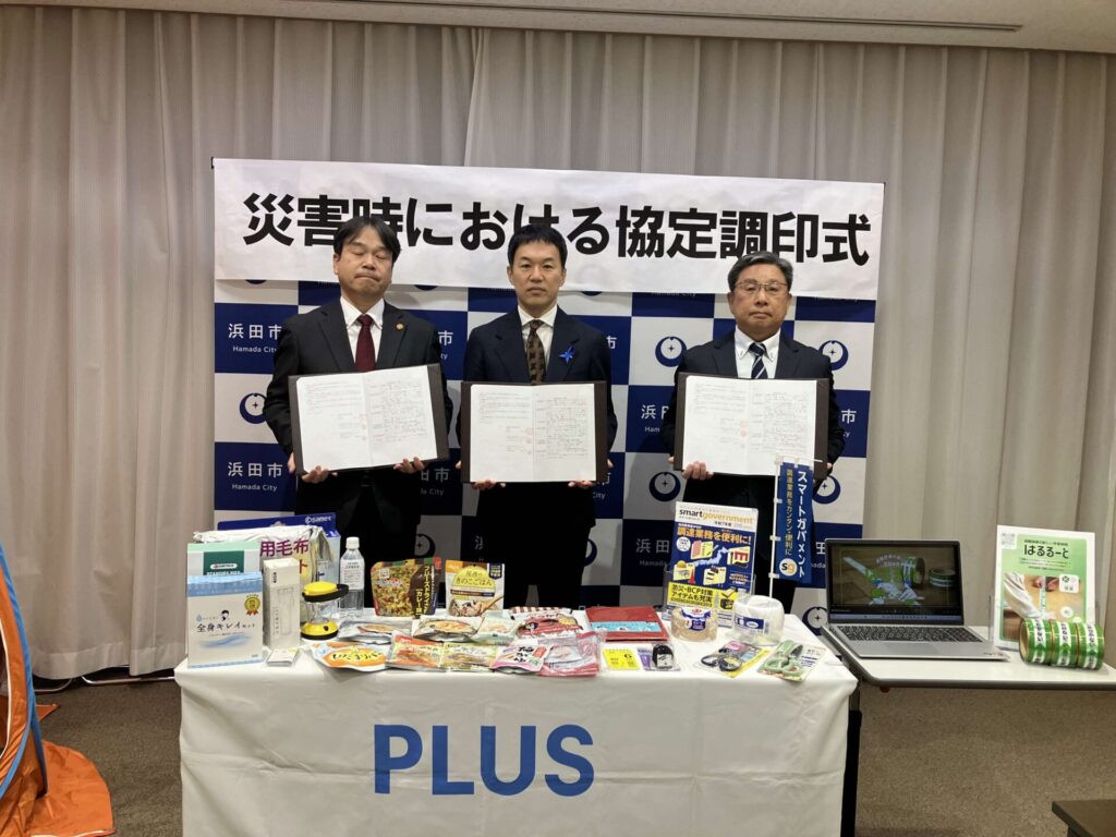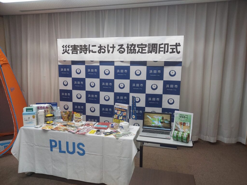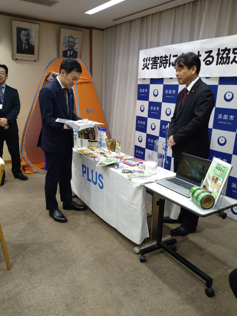12月10日浜田市様、プラスジョインテックスカンパニー様とその代理店である弊社マキシステムズとの間で防災協定の締結式を浜田市役所で行いました。席上プラス様から浜田市長三浦大紀様他防災安全課の皆様に、スマートガバメント(自治体様向け通販サイト)を利用しての災害時復旧時の円滑な物資供給の説明がありました。また弊社が今後取り組む防災教育ツール「はるるーと」の紹介もさせていただきました。