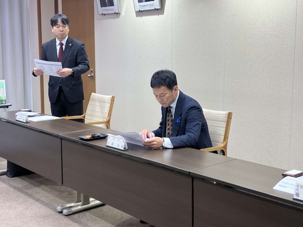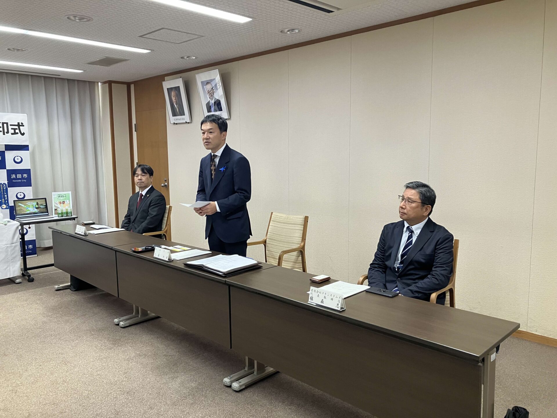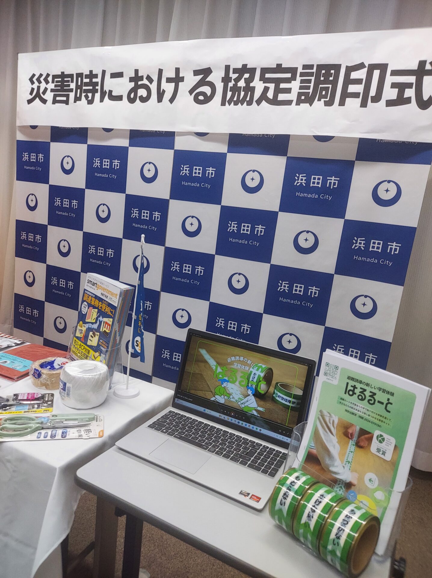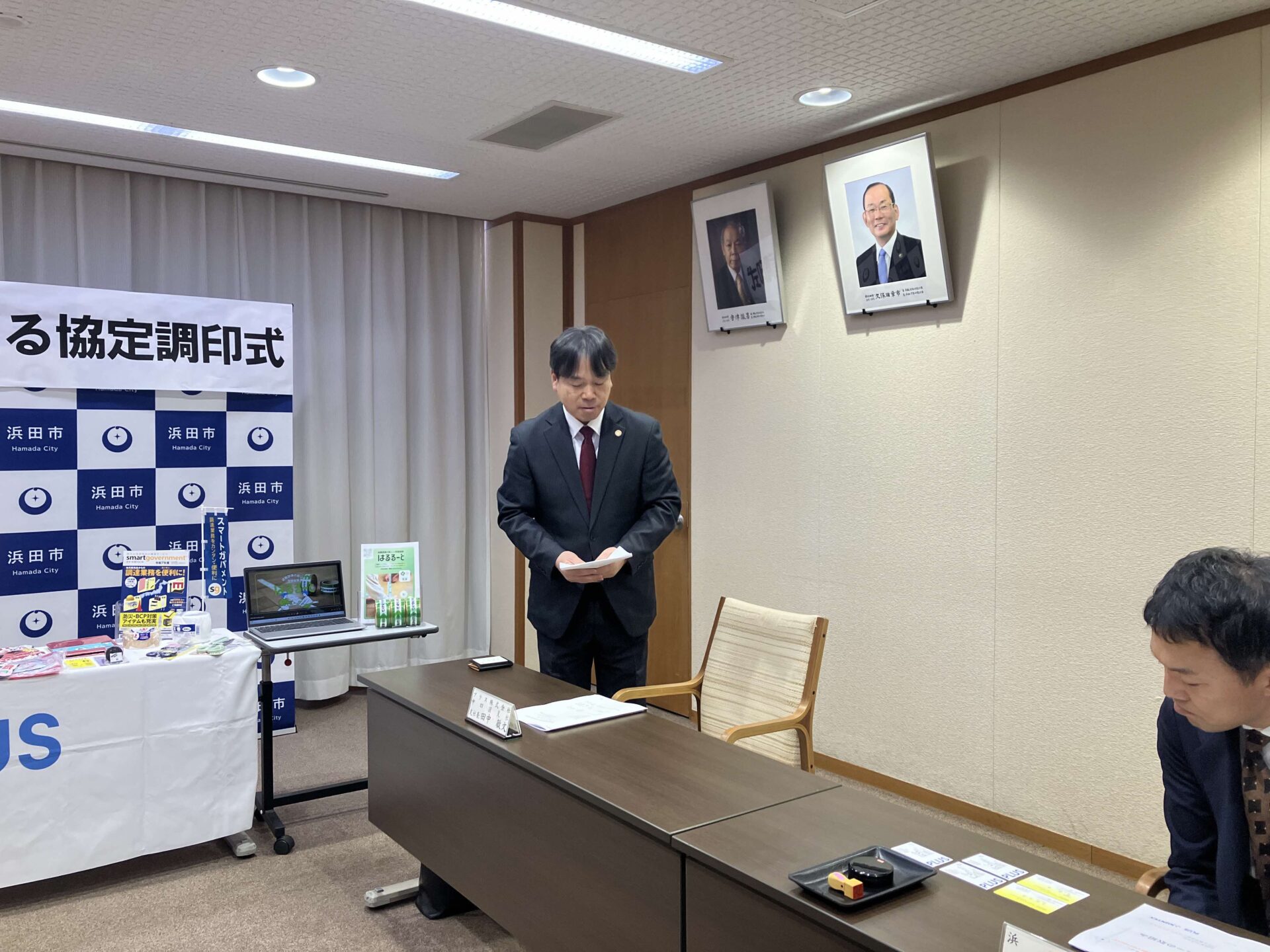 12月10日浜田市様、プラスジョインテックスカンパニー様とその代理店である弊社マキシステムズとの間で防災協定の締結式を浜田市役所で行いました。席上プラス様から浜田市長三浦大紀様他防災安全課の皆様に、スマートガバメント(自治体様向け通販サイト)を利用しての災害時復旧時の円滑な物資供給の説明がありました。また弊社が今後取り組む防災教育ツール「はるるーと」の紹介もさせていただきました。